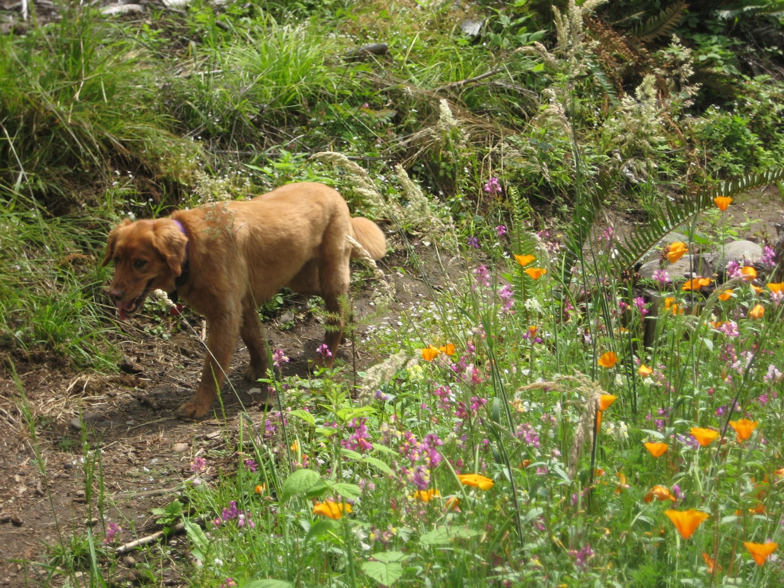 In about ten minutes, we go through a beautiful area where orange wildflowers are blooming. We come to a fork, but it's just a side trail that re-connects shortly.